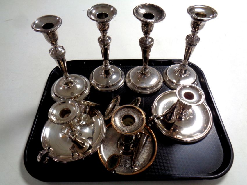A tray of two pairs of plated candlesticks together with four further candlesticks with snuffers.