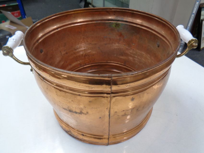 An antique copper, brass and porcelain handled pot