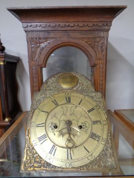 A 19th century carved oak longcase clock hood with movement and brass face, Webster of Whitby