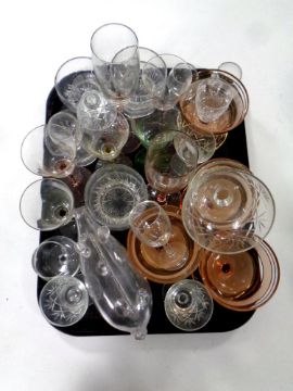 A tray containing 20th century glassware to include assorted drinking glasses, grapefruit bowls, glass figure of a pig