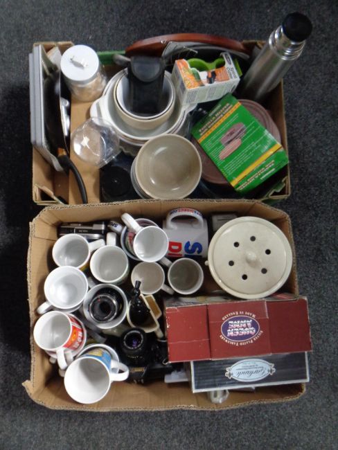 Two boxes of kitchen ware, mugs, Canon T70 camera with lens
