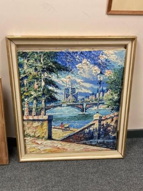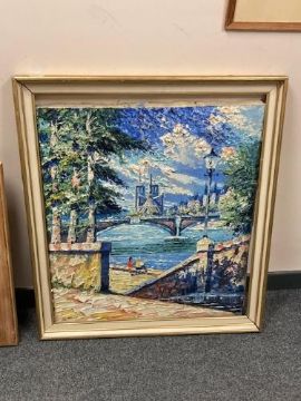 Continental school : A view across a river with bridges beyond, oil on canvas, 65 x 74 cm
