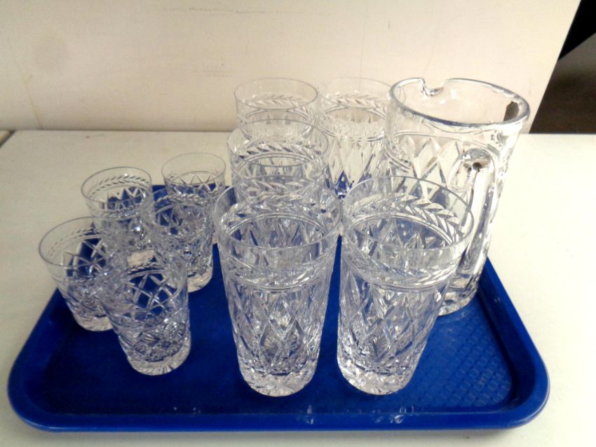 A tray containing a good quality lead crystal water jug with five matching high ball glasses and five further whisky tumblers