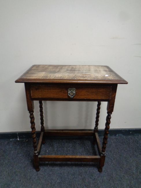 A late Edwardian oak barley twist occasional table fitted a drawer