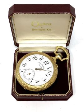 A large 19th century gold plated pocket watch by Doxa, with rowing scene to reverse of case.