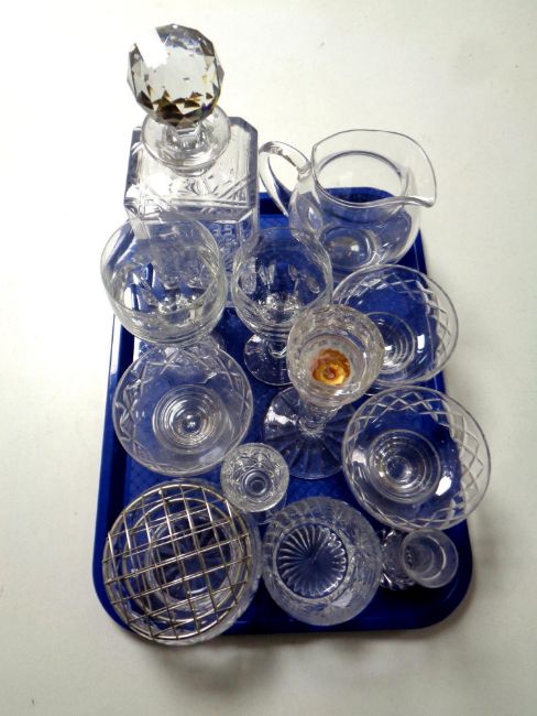 A tray containing a quantity of glassware to include cut glass decanter with stopper, candlesticks, assorted drinking glasses, rose bowl etc