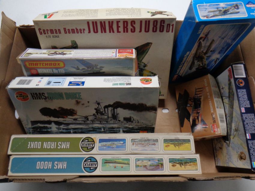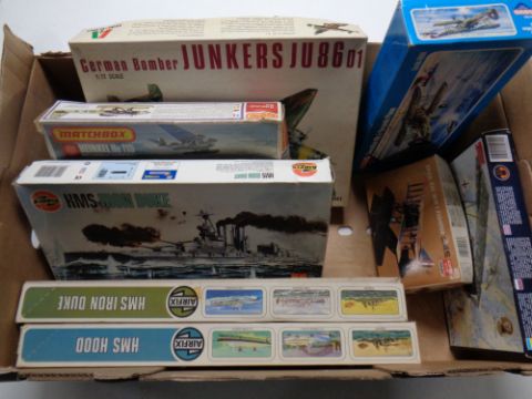 A box containing eight plastic modelling kits to include Airfix and Matchbox naval boats and military aircraft