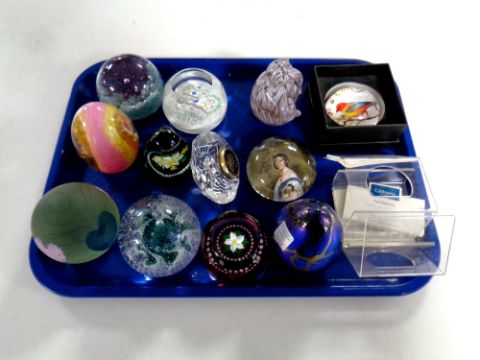 A tray containing ten assorted glass paperweights to include Caithness, together with a Waterford Crystal desk clock ** Proceeds going to Guide Dogs for the Blind **
