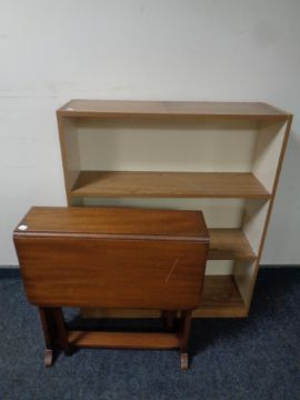 A set of teak effect open bookshelves together with a drop leaf table