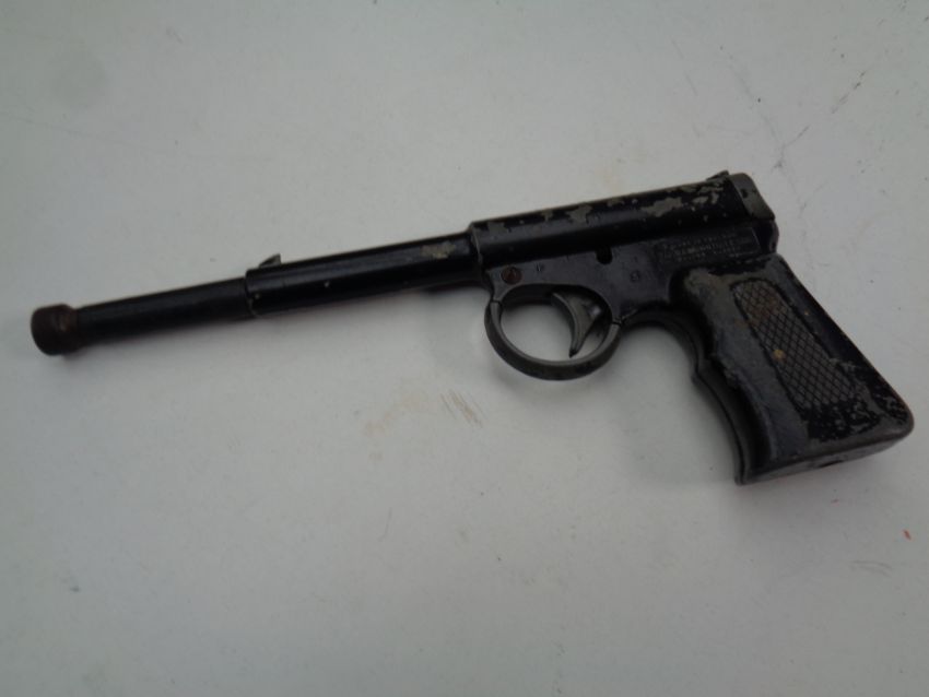 A tray containing a TJ Harrington and Son air pistol together with a collection of assorted knives to include machete, divers knife, pocket knives, knife and sheath, sharpening stone