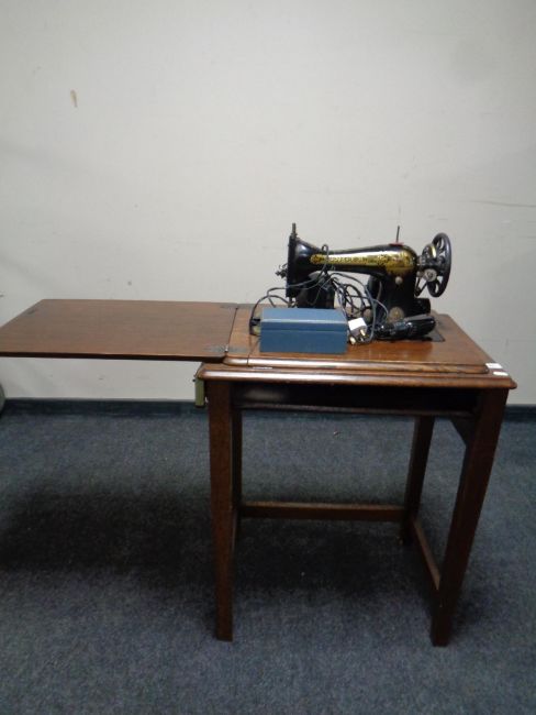 A 20th century Singer electric sewing machine in oak table