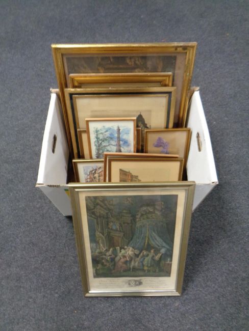 A box containing a quantity of antique and later continental pictures to include French colour etchings, black and white etchings, Venice canal scenes etc