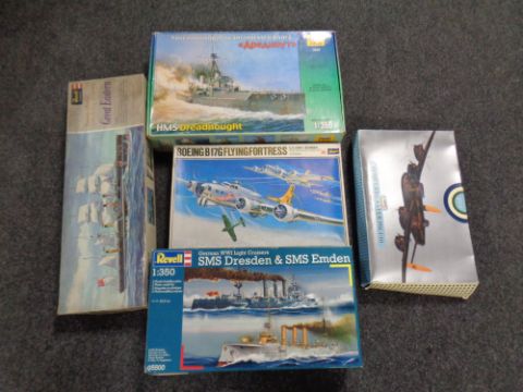 A box containing five boxed modelling kits to include Revell, SMS Dresden, Great Eastern Steam Ship etc