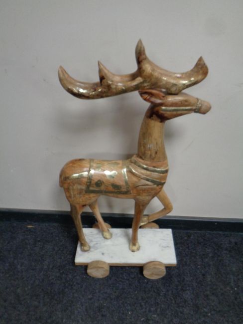 A carved wooden reindeer on wheeled base