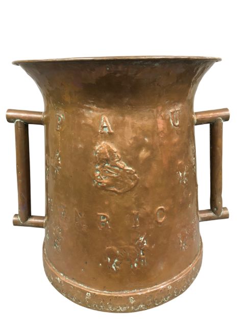 An eighteenth century twin handled vessel, with embossed cattle decoration and inscribed 'Pau Henric IV', height 51 cm, diameter 56 cm to carry handles.