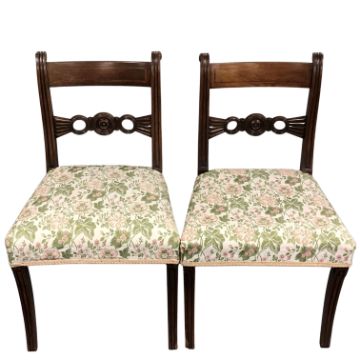 Five Regency inlaid mahogany dining chairs, with carved circular back motifs on sabre legs, width 49 cm. (5)