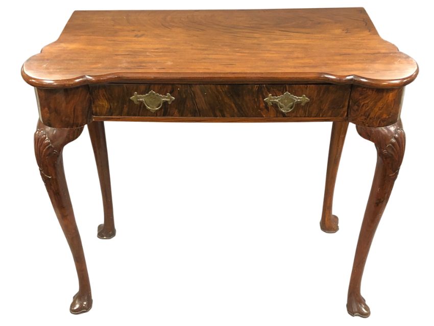 A George II walnut side table, with brass split-pin handles, gentle cabriole front legs with foot feet, height 70 cm, width 80 cm, depth 40 cm.
