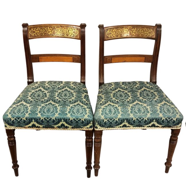 A pair of Regency mahogany dining chairs, inlaid with brass and standing on tapered cylindrical legs, width 49 cm.