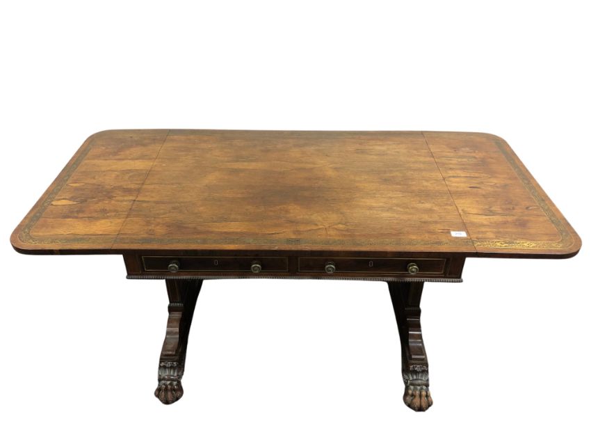 A fine Regency rosewood sofa table, with brass border inlay, hinged flap side extensions with understretcher, fitted two drawers to front and two dummy drawers to reverse, raised on hairy lion paw feet, height 72.5 cm, width 152.5 cm (extended), depth 71 cm.