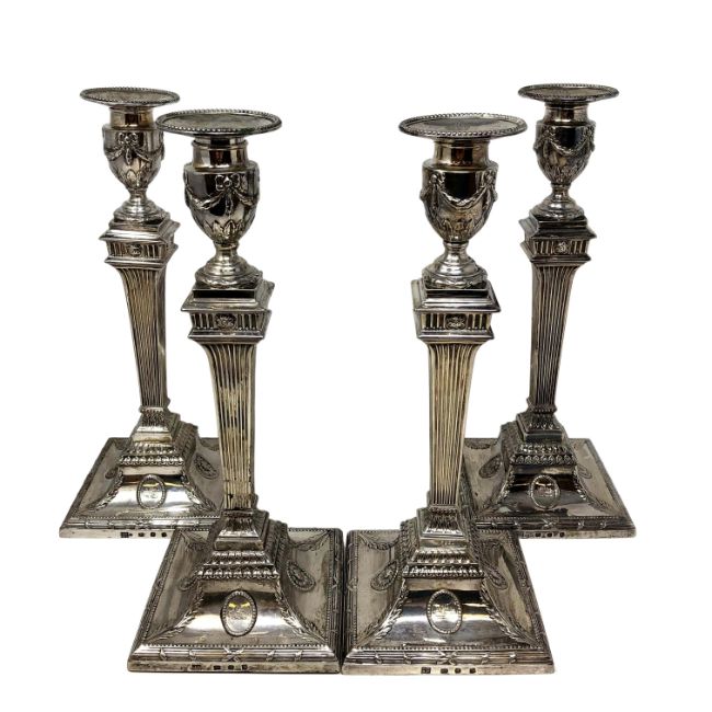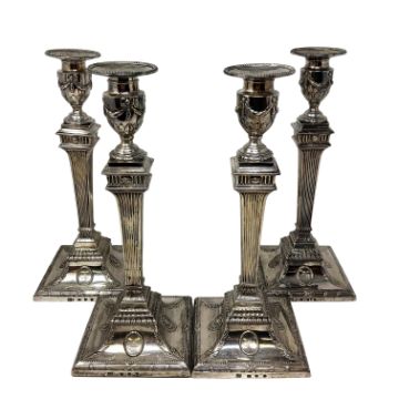 A set of four Neo-Classical silver candlesticks, Robert Makepeace & Richard Carter, London 1777, the tops of urn form and embossed with floral swags, each with detachable sconces engraved with family crest, with fluted, tapering stems, upon stepped, square bases, each 31.5cm high. (4, loaded)