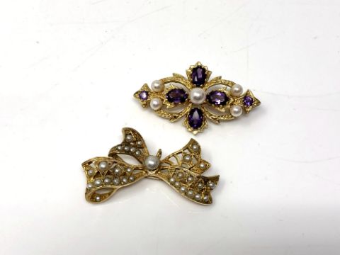 Two gold brooches set with amethysts and seed pearls