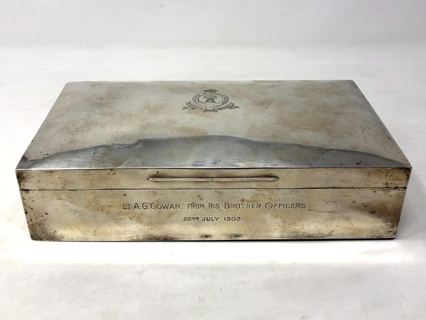 A large Edwardian silver cigarette box of Boer War interest, awarded to Lt. A. G. Gowan of the Lothian and Berwickshire Imperial Yeomanry