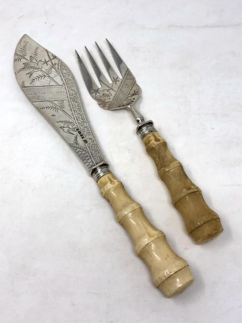 A fine pair of Victorian silver and ivory fish servers, Harrison & Howson, Sheffield 1880, engraved with birds and butterflies amidst foliage (2)