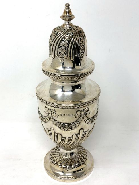 A large ornate silver sugar castor decorated with floral swags, 265g, height 22.5cm.