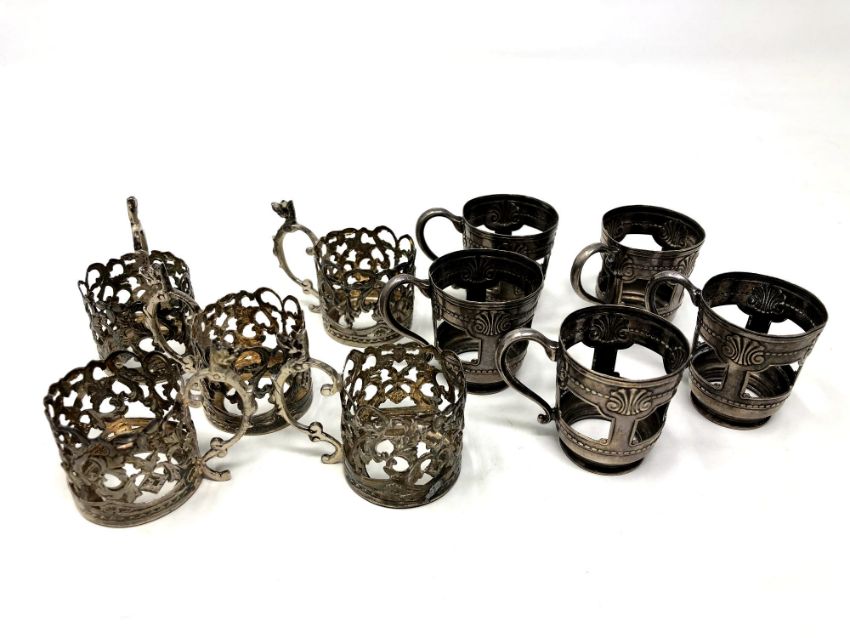 Two sets of five antique silver cup holders. (10)