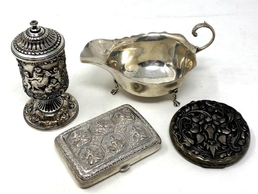 A silver compact, sauce boat, Indian white metal cigarette case and a lidded pot (4)