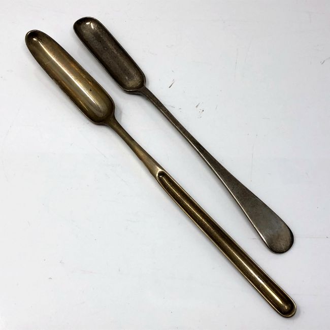 A Georgian silver marrow scoop, maker Thomas Oliphant, with crest, together with another silver marrow scoop (2)