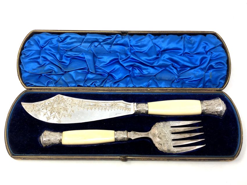 A fine boxed pair of Victorian silver and ivory fish servers, Sheffield 1879.