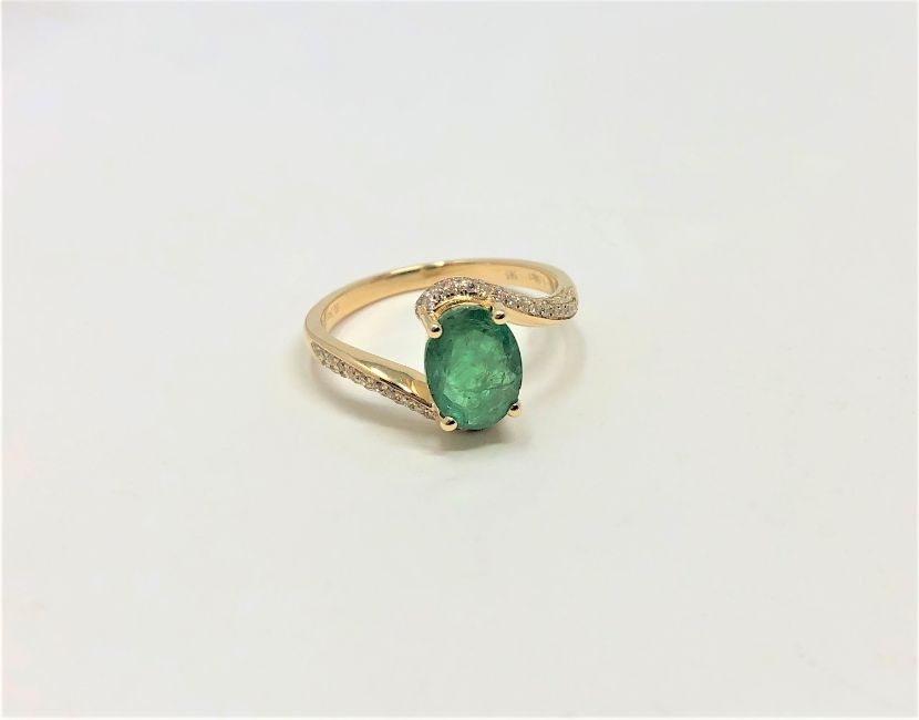 A 14ct yellow gold emerald and diamond ring, featuring centre oval cut emerald (1.38ct), claw set with sixty four round brilliant cut diamonds, size L. With certification.