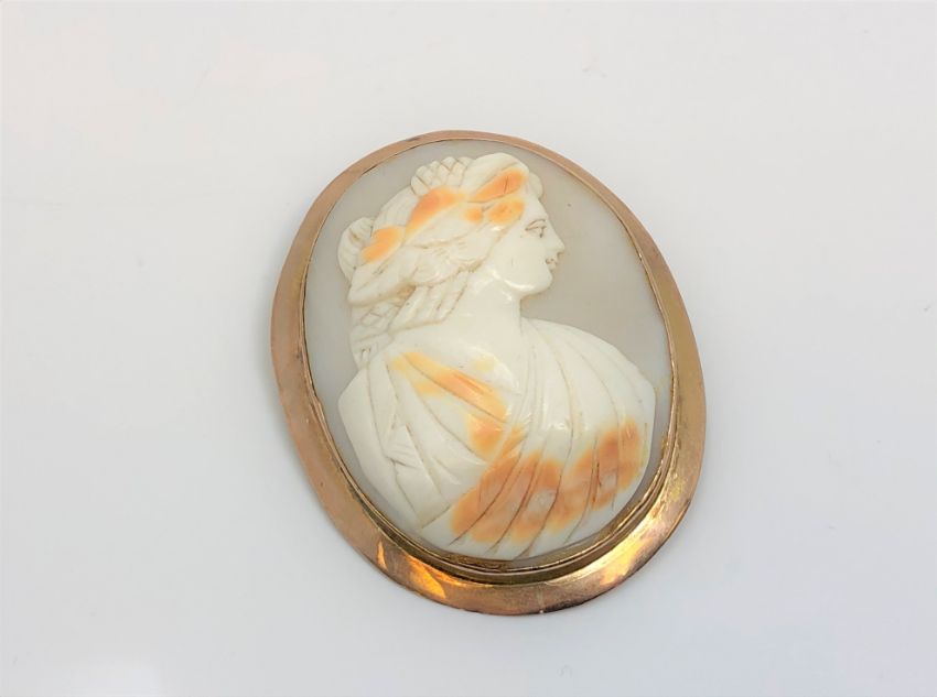 An antique rose-gold cameo brooch, 43 mm x 54 mm.