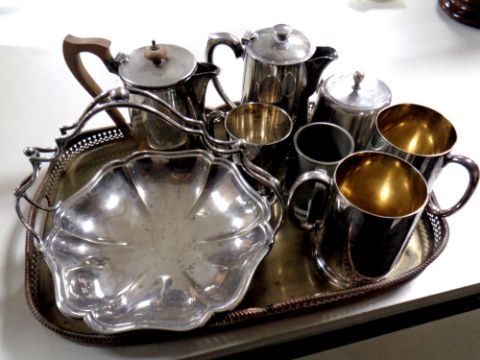 A silver plated serving tray containing plated tea wares, tankard, baskets etc
