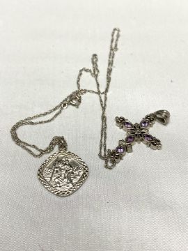 A silver St Christopher pendant on chain together with an amethyst and silver crucifix