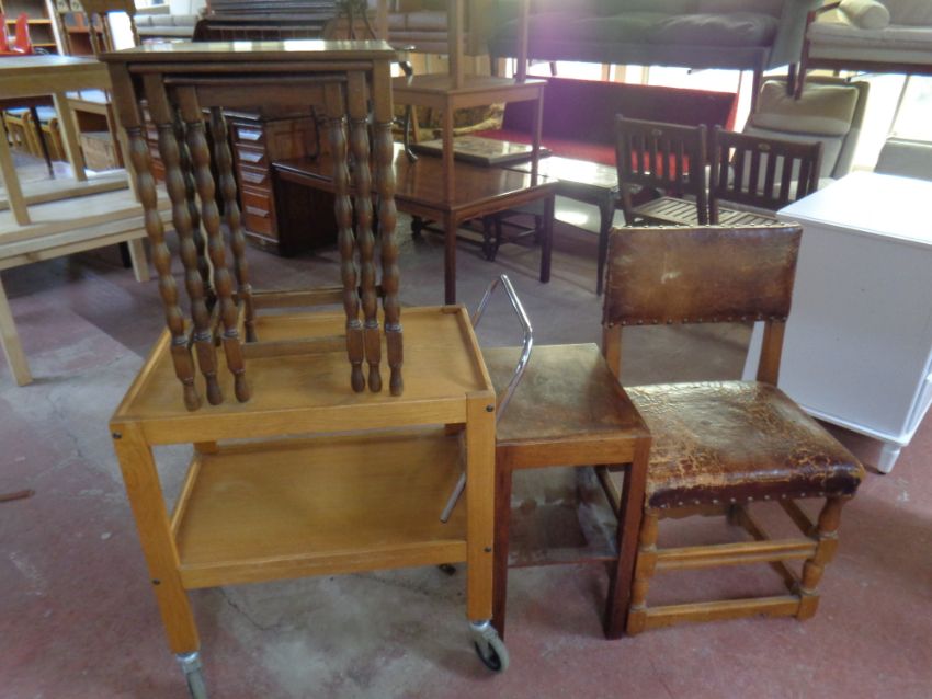 An oak studded leather upholstered dining chair together with a two tier tea trolley, a nest of three beech tables and a further two tier occasional table