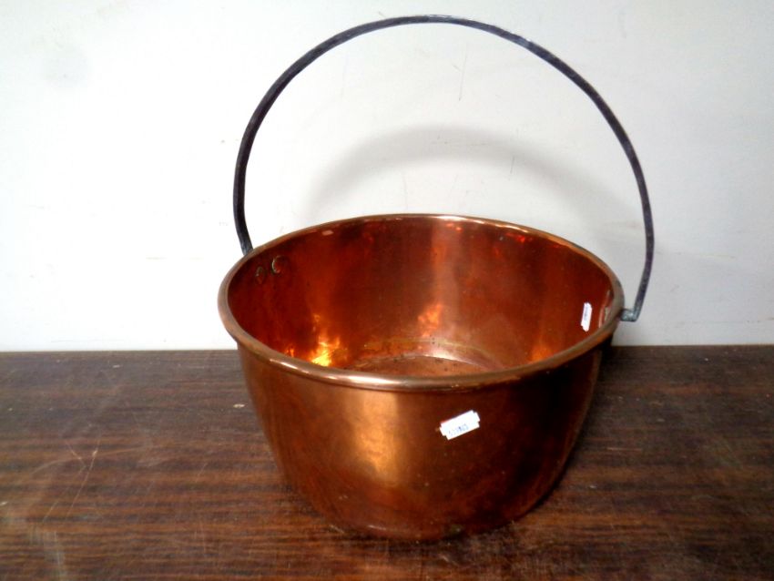 A 19th century copper cast iron handled jam pan