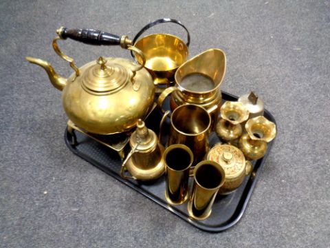 A tray containing antique and later metal wares to include ammunition shell cases, Indian vases, brass teapot, trivets, miniature jam pan, bell etc