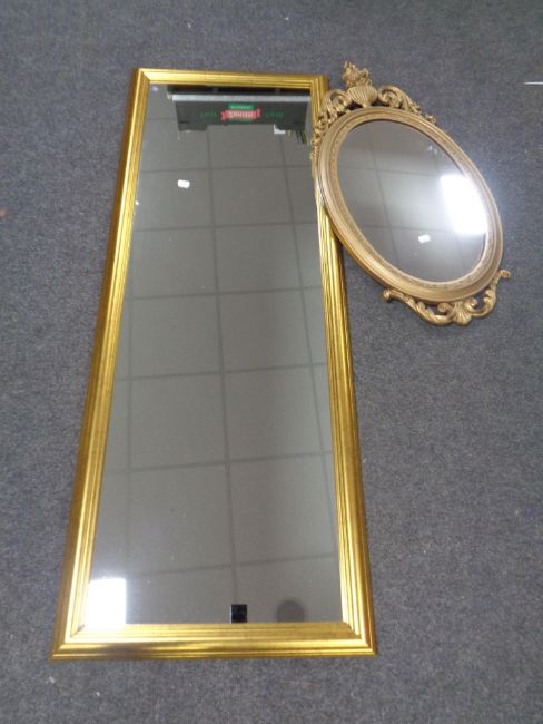 A gilt framed hall mirror together with an ornate plastic gilt framed mirror (largest 130 cm x 50 cm).
