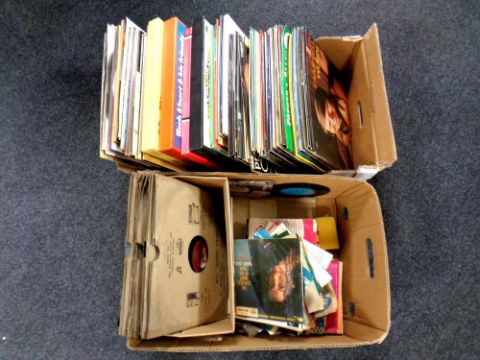 Two boxes containing vinyl LPs, 78s and 45 singles to include compilations, John Denver, musicals, The Beatles etc