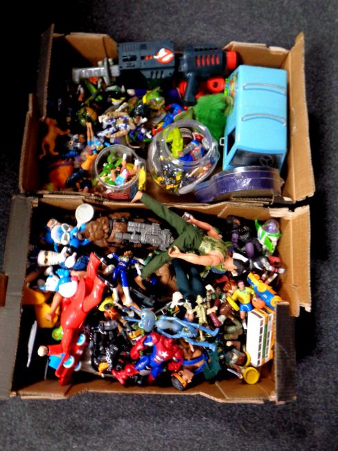 Two boxes containing a large quantity of assorted toys, action figures to include Biker Mice from Mars, Action Man, Thundercats etc