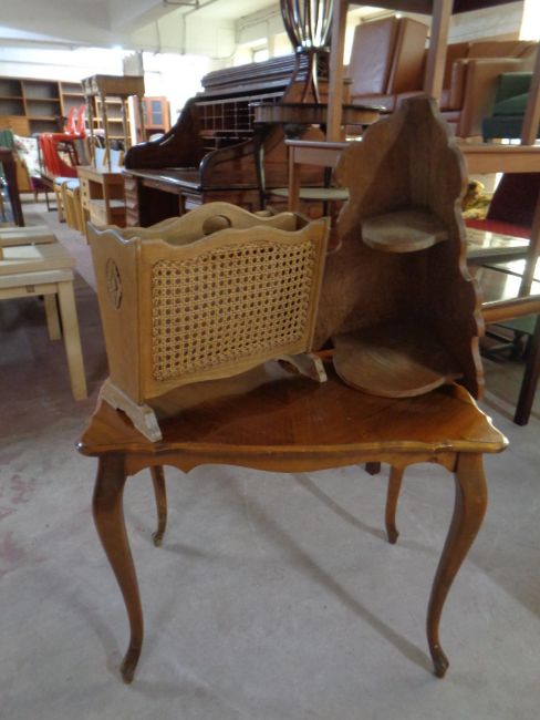 A walnut and beech occasional table on cabriole legs together with an oak corner wall shelf and an oak and bergere magazine rack