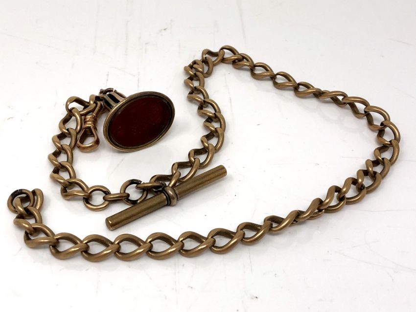 An antique gold plated Albert chain with intaglio carved fob.