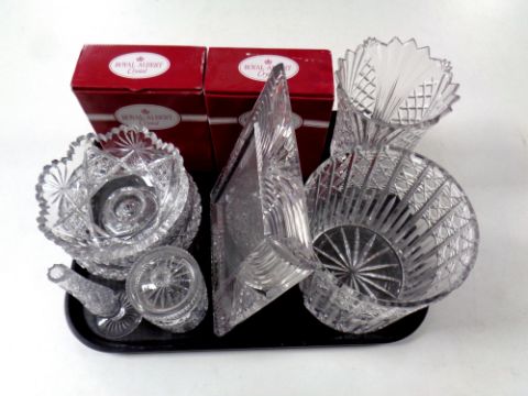 A tray containing 20th century and later cut glass and crystal to include two boxed pairs of Royal Albert crystal wine glasses, photo frame, preserve pots, vases etc