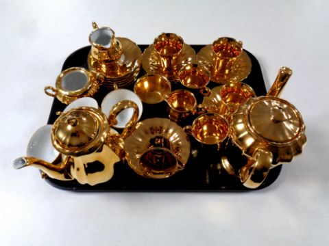 A tray containing a 15 piece Wade gilt coffee service together with a further Bavarian gilt tea service