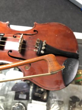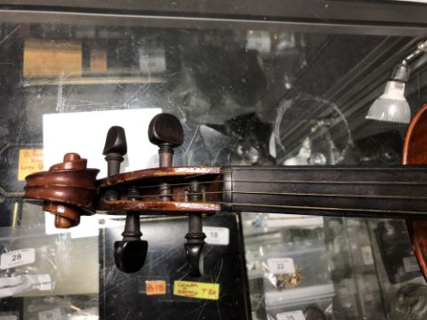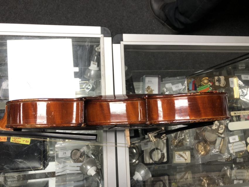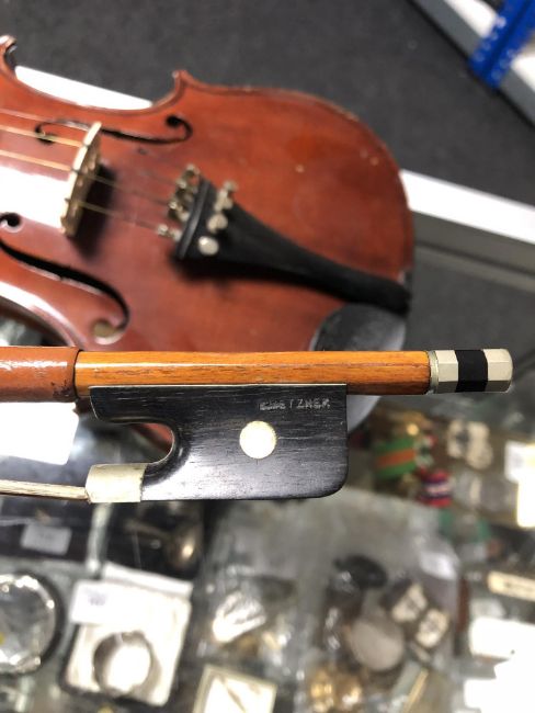 A 20th century violin, two-piece 14" back, with label 'Nachahmung von Nicolaus Amati fecit anno', with bow stamped Metzner, in coffin case