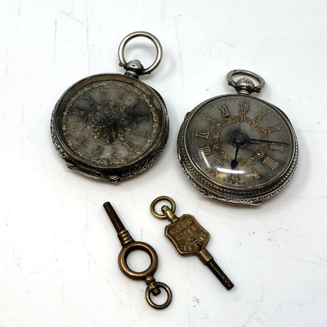 Two very ornate Victorian silver fob watches with gold detail on silver dials, one by JW Ramsay, Felling on Tyne, with keys.