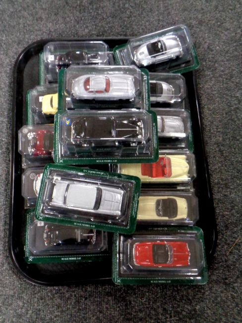 A tray containing 14 die cast classic cars in plastic bubbles