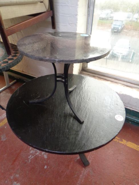 A circular marble topped occasional table on metal pedestal together with similar coffee table